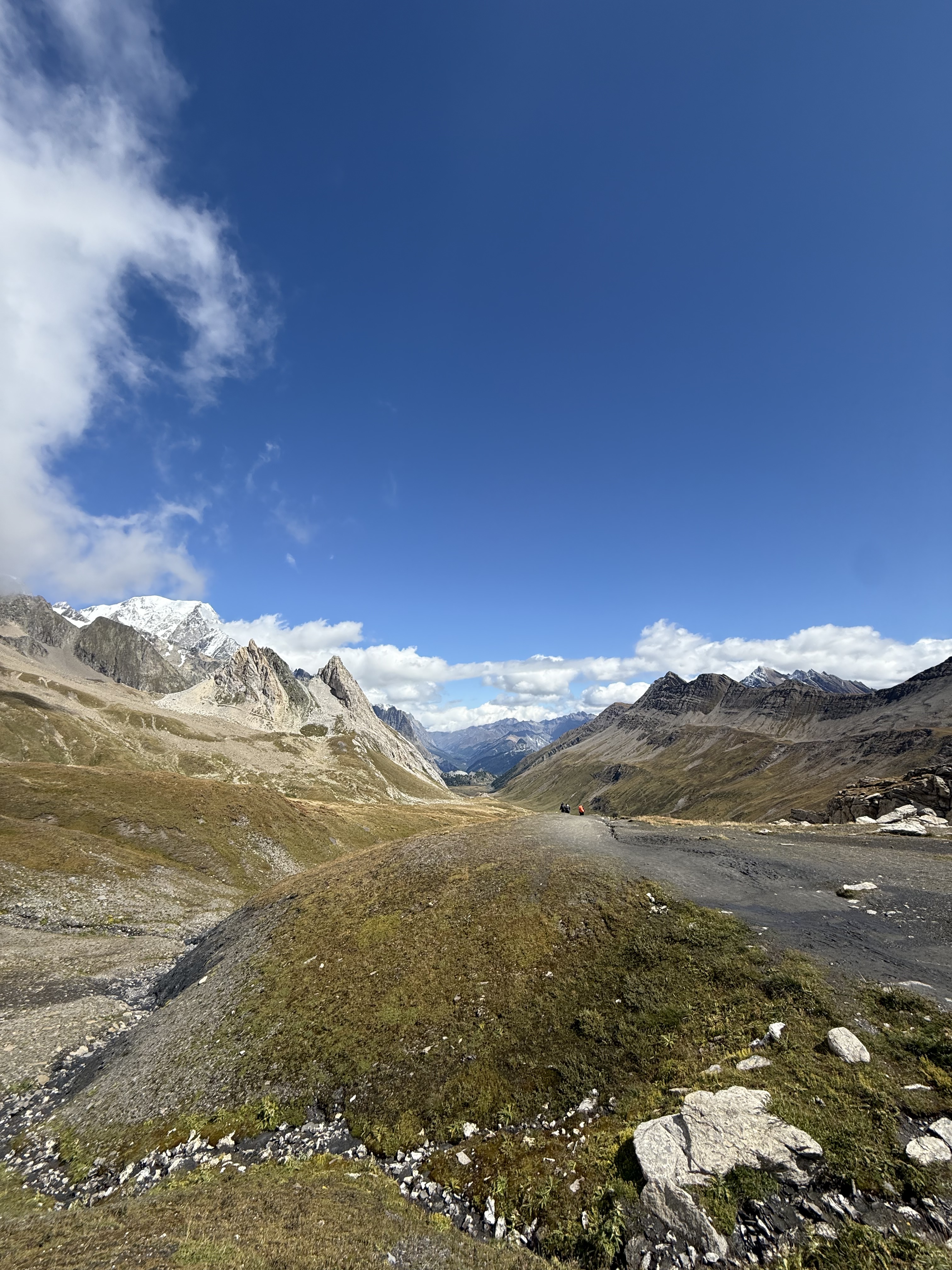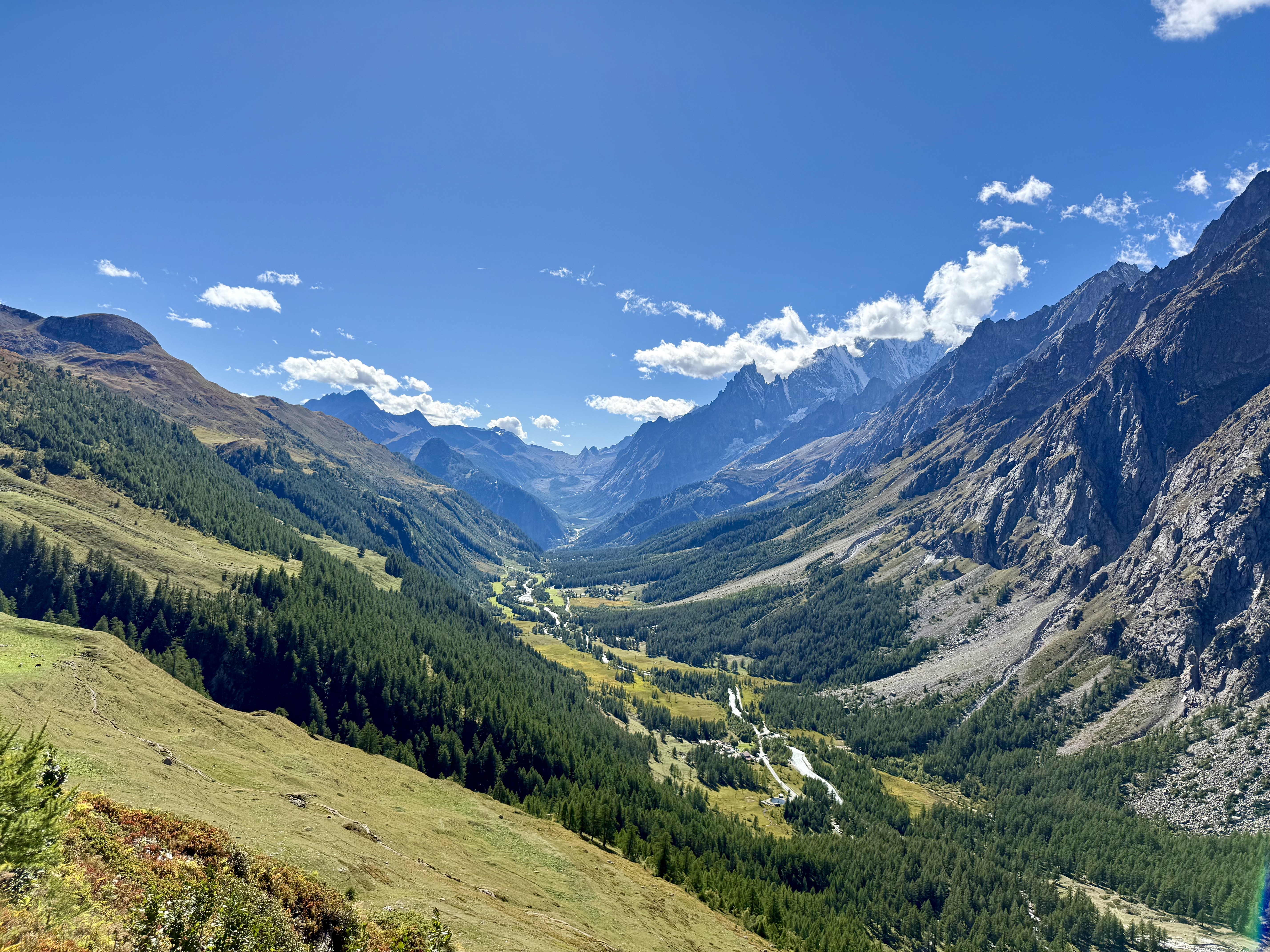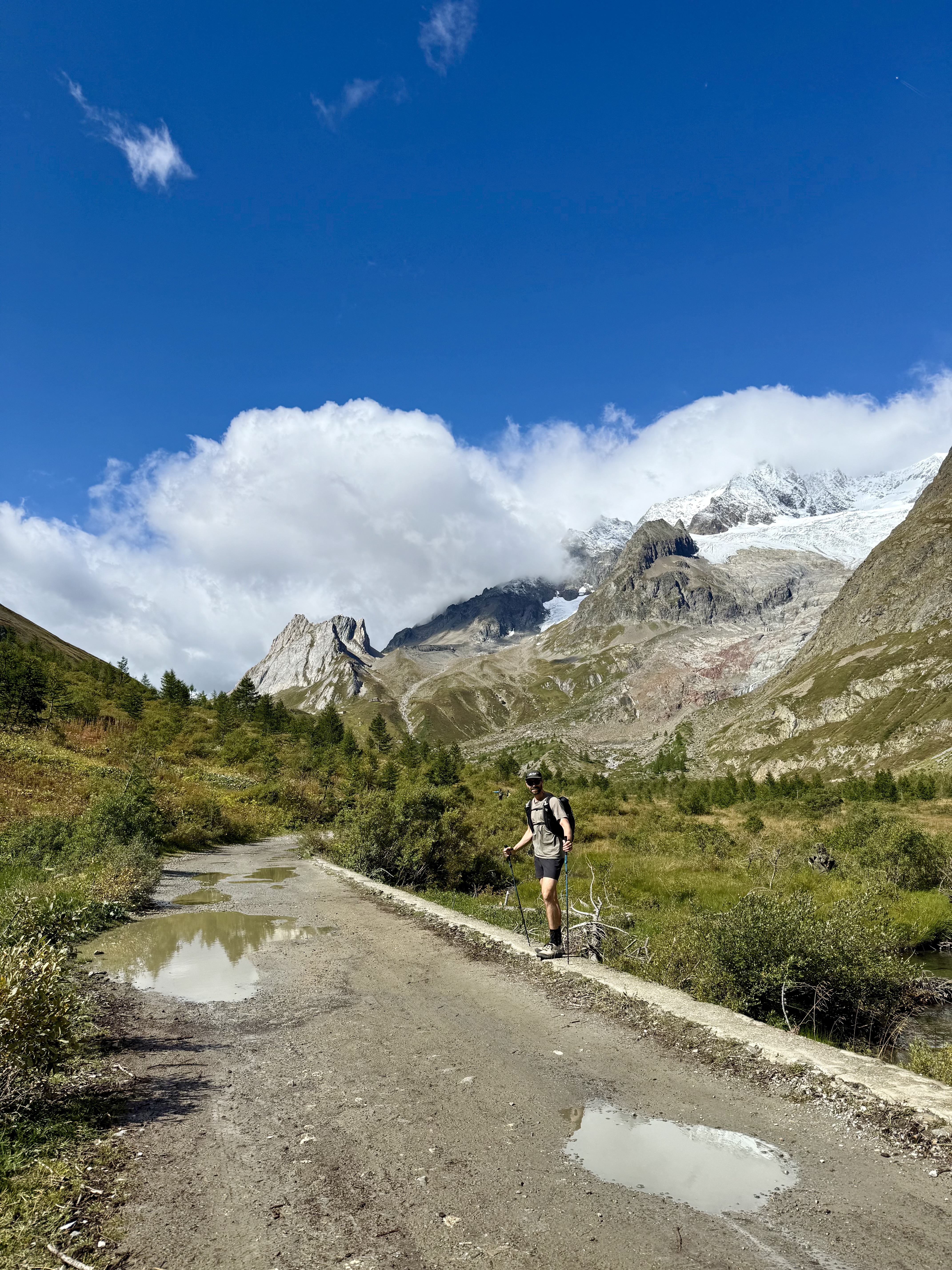 The bus took us a few stops past La Fouly to Ferret, and we began to hike uphill through cow pastures towards Grand Col Ferret, where we got our first view of the Italian side of the Mont Blanc (or Monte Bianco, at that point) massif. As soon as we got to Italy the people were friendlier, the food tastier, and the views better. This was one of my favourite sections of trail and I soon forgot my dramatics from the morning. I can’t wait to run here in the future, the trails are smooth and flowy and the views are some of the best I’ve ever seen. We stopped at a refuge or two for snacks and espresso and eventually made our way down to Lavachey where we caught a free tourist bus to Courmayeur. I couldn’t recommend this section enough and will definitely return here.