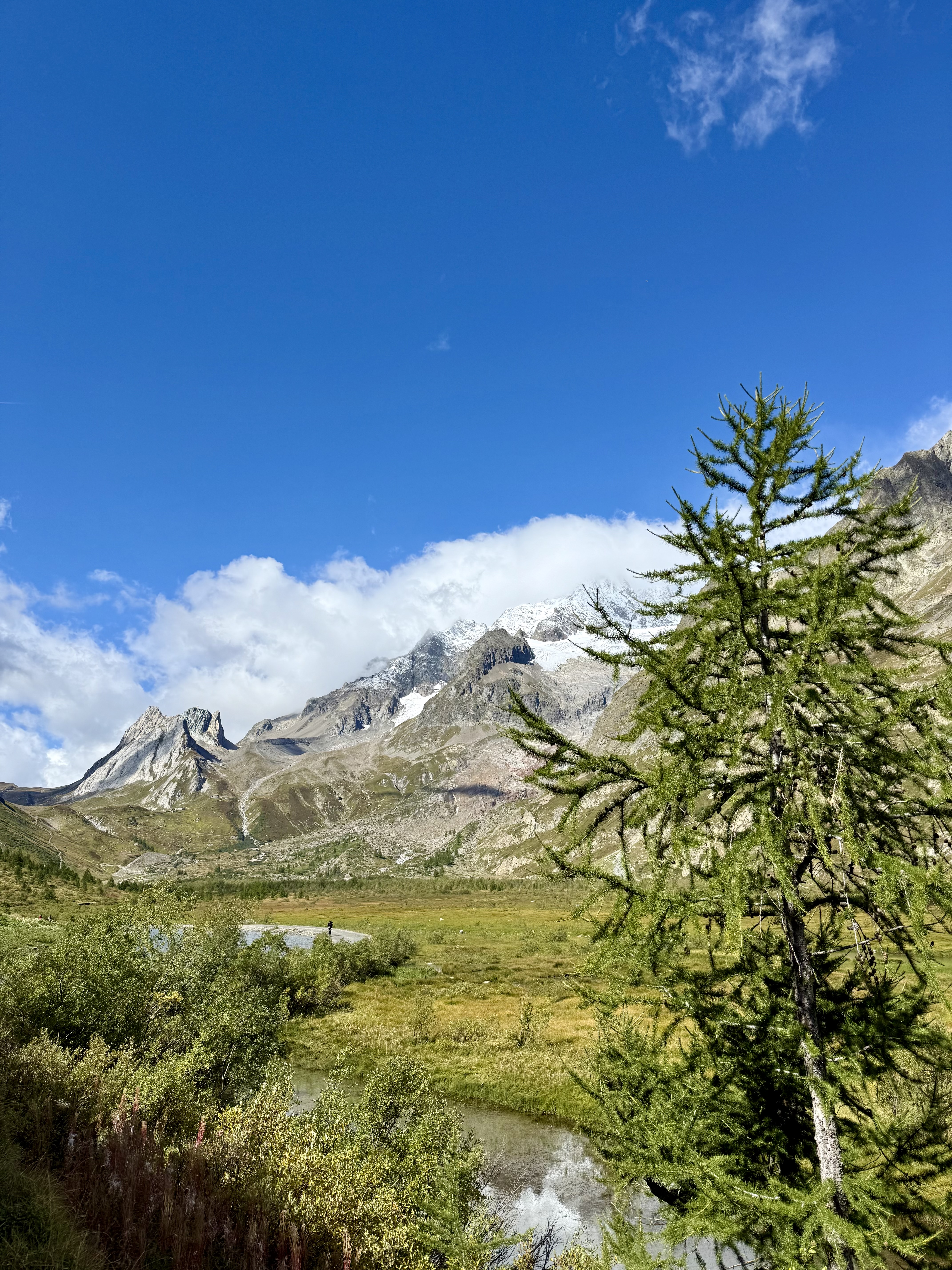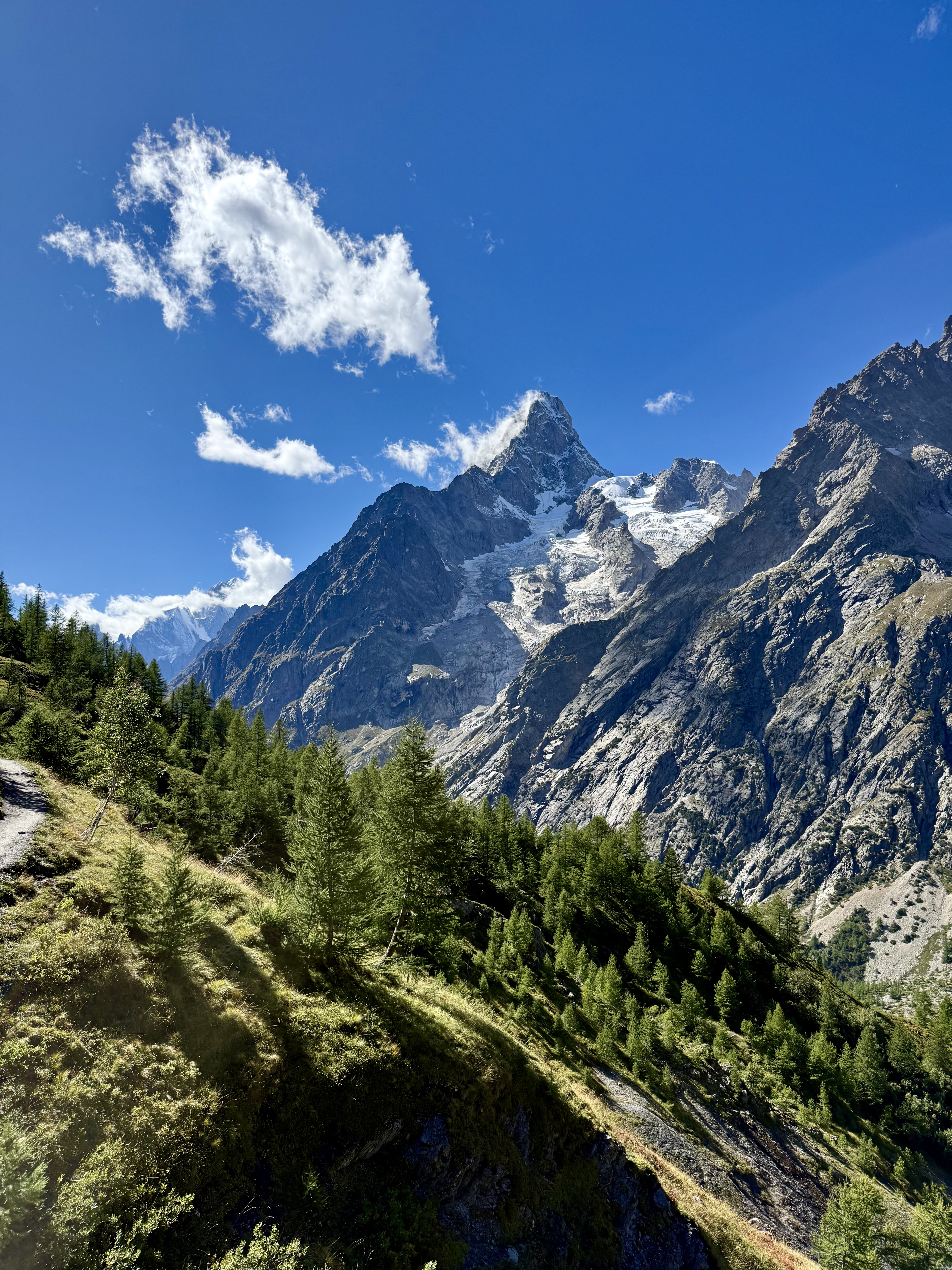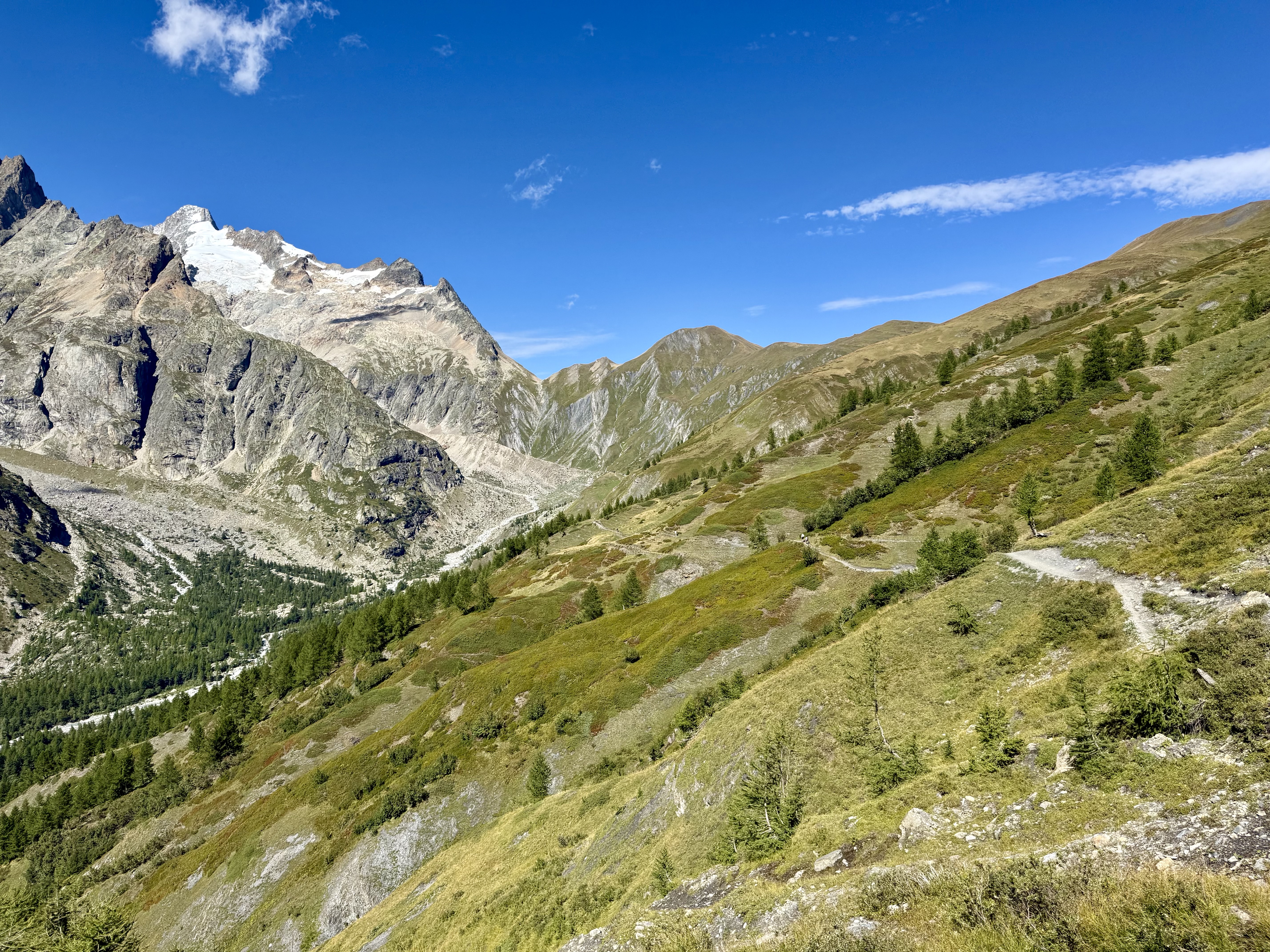 The bus took us a few stops past La Fouly to Ferret, and we began to hike uphill through cow pastures towards Grand Col Ferret, where we got our first view of the Italian side of the Mont Blanc (or Monte Bianco, at that point) massif. As soon as we got to Italy the people were friendlier, the food tastier, and the views better. This was one of my favourite sections of trail and I soon forgot my dramatics from the morning. I can’t wait to run here in the future, the trails are smooth and flowy and the views are some of the best I’ve ever seen. We stopped at a refuge or two for snacks and espresso and eventually made our way down to Lavachey where we caught a free tourist bus to Courmayeur. I couldn’t recommend this section enough and will definitely return here.