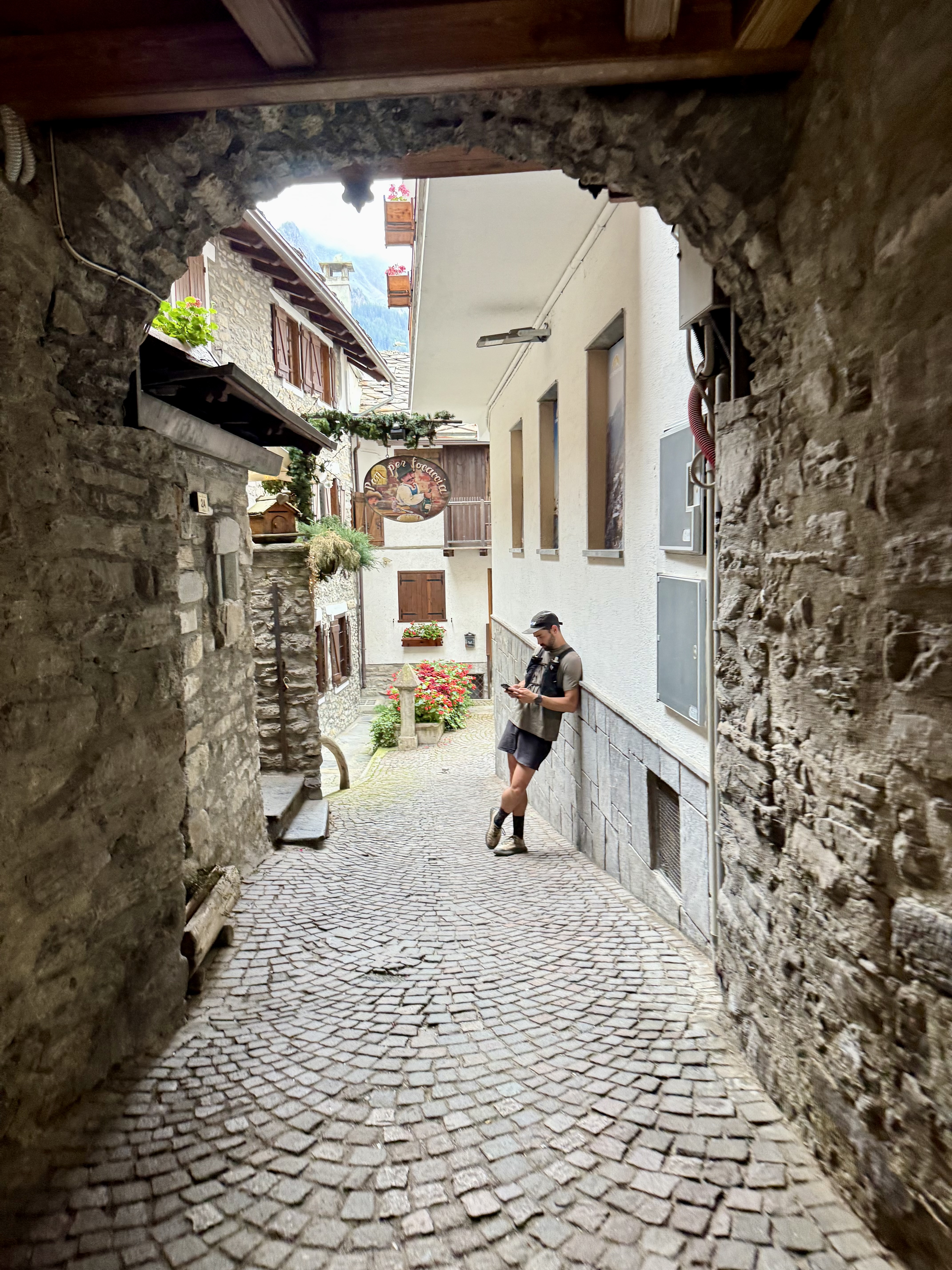 Because we’d cut out a huge section of the TMB in Switzerland, we were able to take a rest day in Courmayeur. Similar to Chamonix, Courmayeur is stunningly beautiful. I was immediately happy we had changed our plans and looked forward to two nights in the same bed and not chilli for dinner. We went to a nearby restaurant for dinner and (unsurprisingly) stumbled upon really good pizza. On the recommendation of our friends Mercedes and Nico, we stayed in Le Massif, a hotel near downtown in Courmayeur. The bed was super comfortable and the breakfast buffet was like nothing I’ve ever seen. If you’re in Courmayeur, go here! Our first morning in Courmayeur we spent over 90 minutes at the breakfast buffet enjoying good coffee, made to order omelettes, baked goods, and nearly every other breakfast item we could think of. I spent the rest of the day relaxing in the hotel room (pictured), with a goal to move as little as possible and sleep as much as possible (pictured), only leaving three times (all to get food), while Eric went on a 30k training run in the mountains South of town (partially following the TMB).