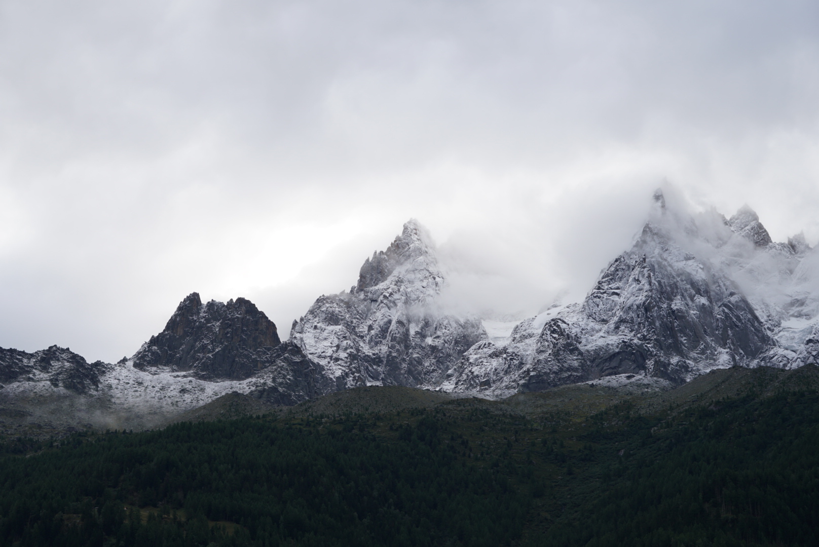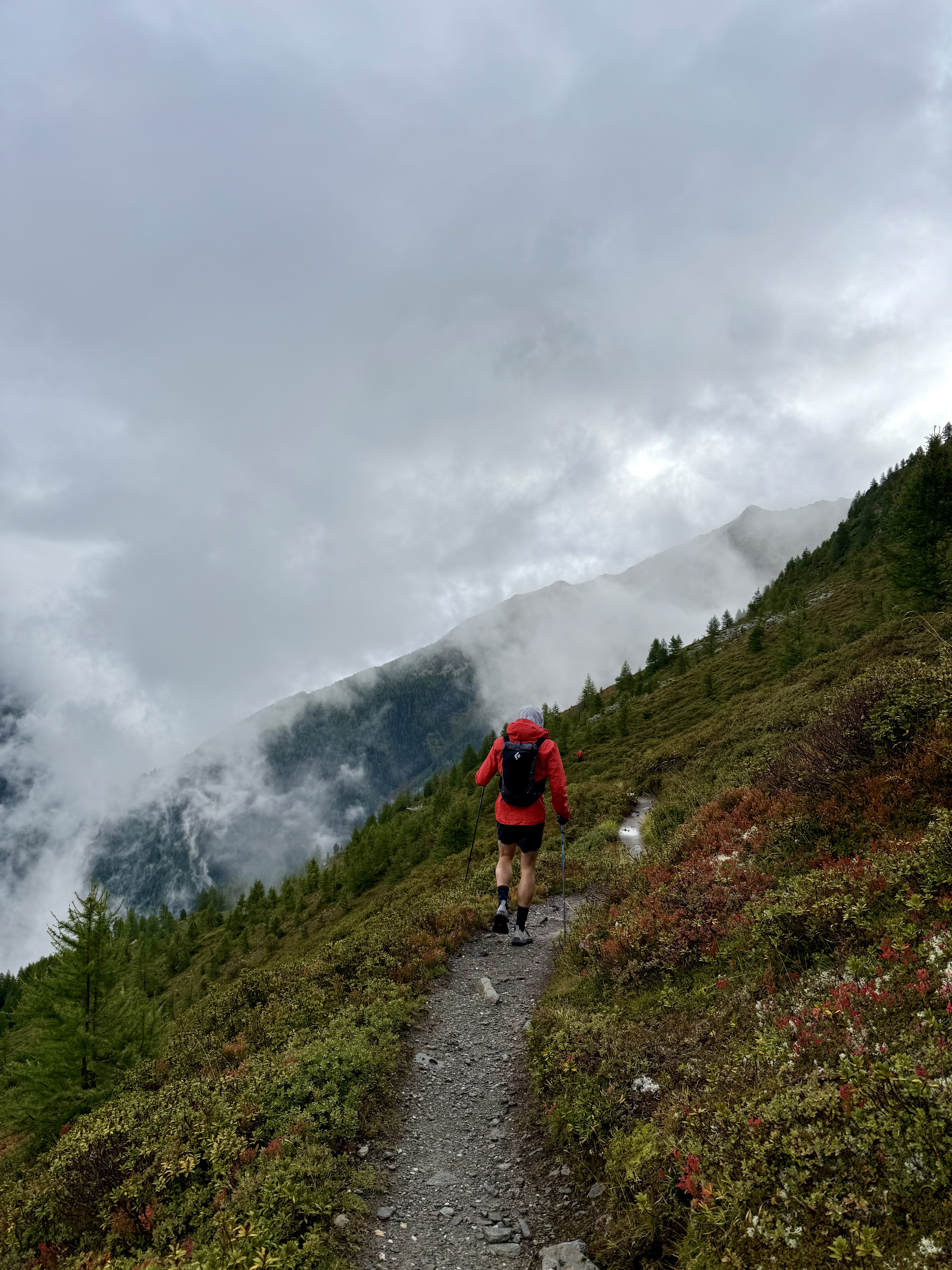 The first day was about 8km through mist, fog, and clouds from Le Tour to Col de Balme. We got a few glimpses of the mountains around and the views would have been stunning in better weather. Not too much to say about this day except that the trails looked exceptionally runnable and I attempted a few minutes of lumbering whale-jog before calling it and accepting my fate as a pregnant hiker.