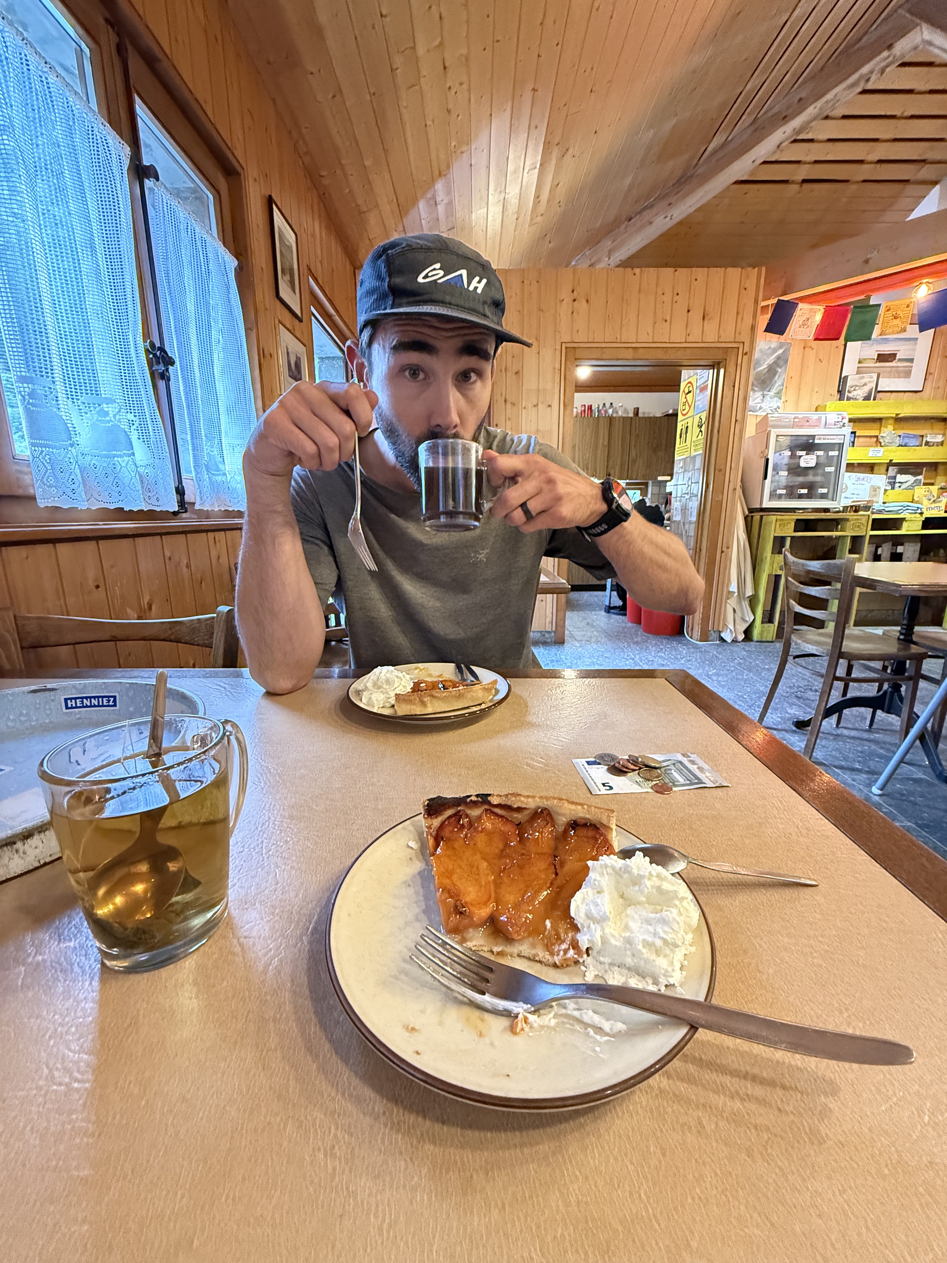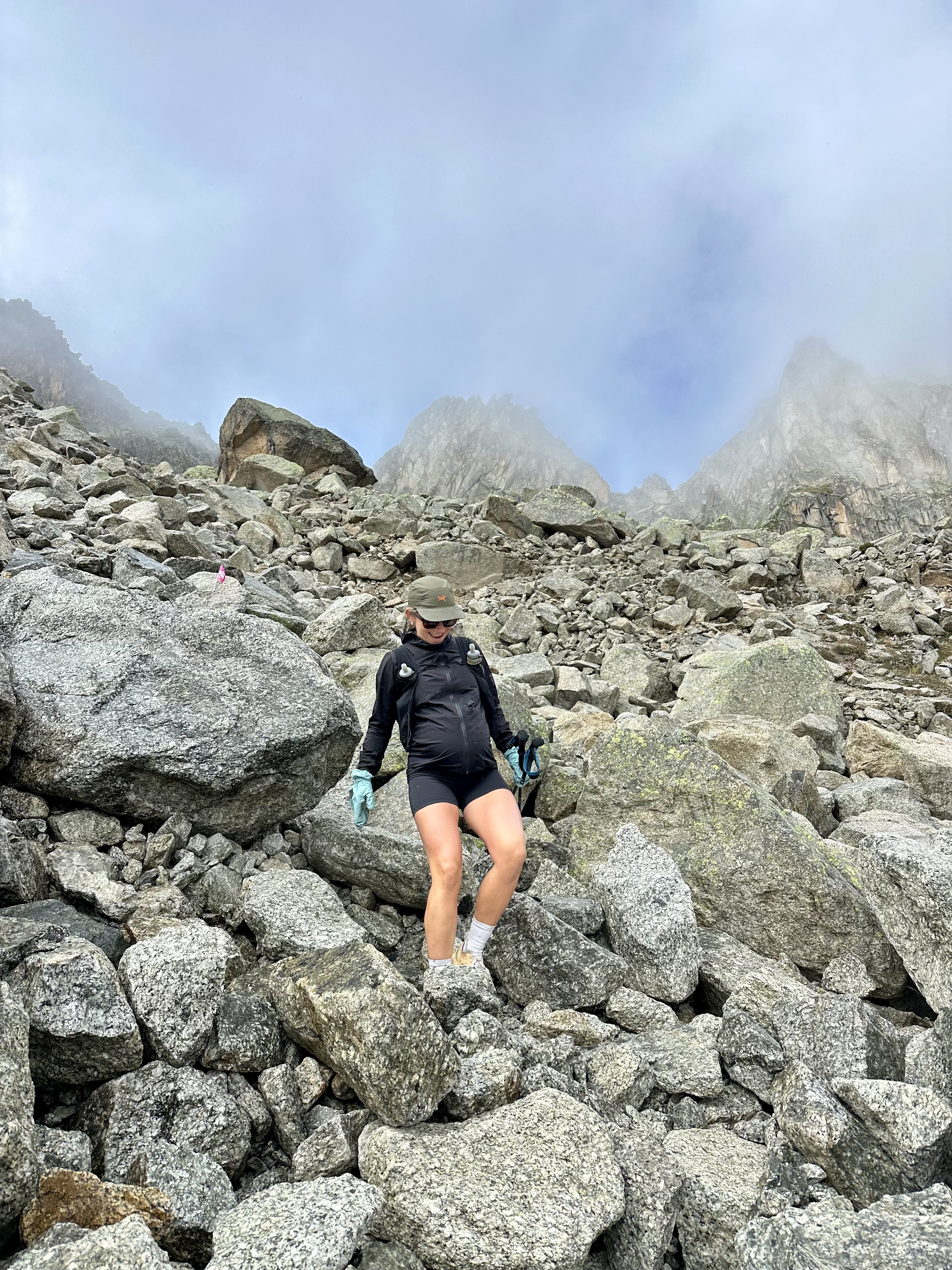 The next morning weather was better and we decided to take the Fenetre d’Arpette route through the mountains instead of the regular TMB, on the recommendation of the hut custodian. It was a bit shorter in distance but more technical and with better views of nearby glaciers. To get there, we descended into a valley (where we had an excellent slice of peach pie) and then out the other side, beside a big glacier. Weather was a bit mixed with some rain and snow near the pass, but overall pretty good. We arrived at our next refuge, Relais d’Arpette, midafternoon and enjoyed cold beverages and board games (we brought Quoridors, a fun and portable board game made locally in Squamish, gifted to us by our friends Myrika and Vincent) until dinner. We were surprised to once again be served chilli for dinner, and I secretly started to grow weary of the food in Switzerland (though they partially redeemed themselves by also serving picked beets in the salad, anything pickled being the key to my heart while pregnant). Relais d’Arpette was one of the few huts that still had availability when I booked in June, and a private room with a ‘private’ (but shared with the other rooms nearby?) balcony was over $400CAD per night. The private rooms had great showers and comfortable beds. Once again, my poor pregnant body resisted all attempts at sleep.