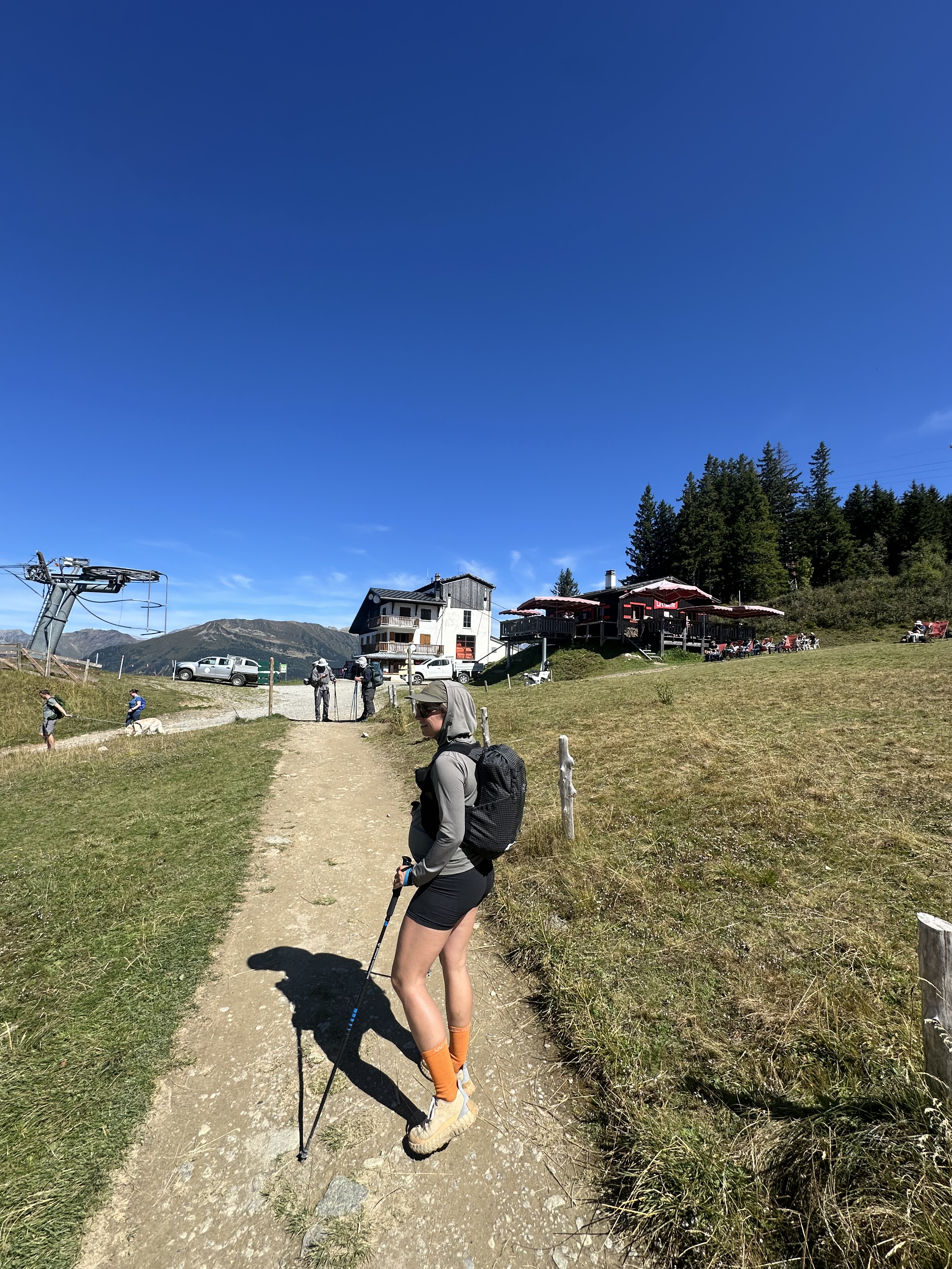 The next day, our second to last, we climbed up to Col du Bonhomme and then down to Les Contamines. One of our favourite stops was at Chalet Refuge de Nant Barrant where we had great food in a lovely garden setting. This day had some more great views and was very busy, with nearly everyone going in the opposite direction as us (we did the route clockwise instead of counterclockwise because there wasn’t much hut availability when I booked in June). We realized most people would have been just a day or two into their TMB at this point, and people were definitely struggling on the climb. I had a lot of people look at me with wide eyes, asking if I was doing the whole TMB while pregnant. We wondered if they’d be able to close the loop. We arrived in Les Contamines midafternoon and checked into our accommodation, Le Pontet. A campsite/cabins/dorm situation with the vibe of an American KOA, which is to say I would not recommend it, but it was fine. Once again, no sleep for me.